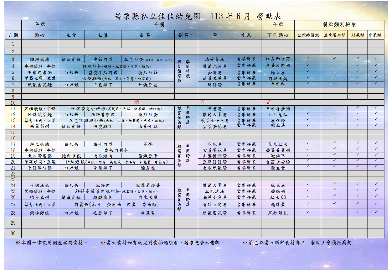 113年6月份餐點表