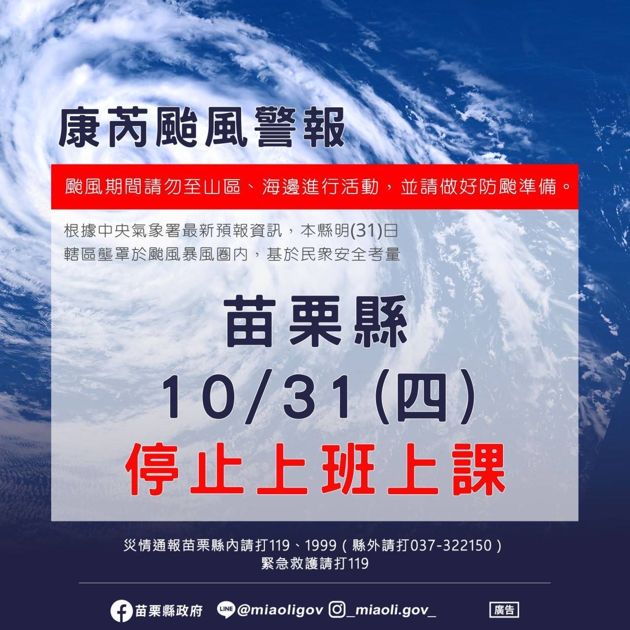 苗栗縣113年10月31日(星期四)停止上班、停止上課。