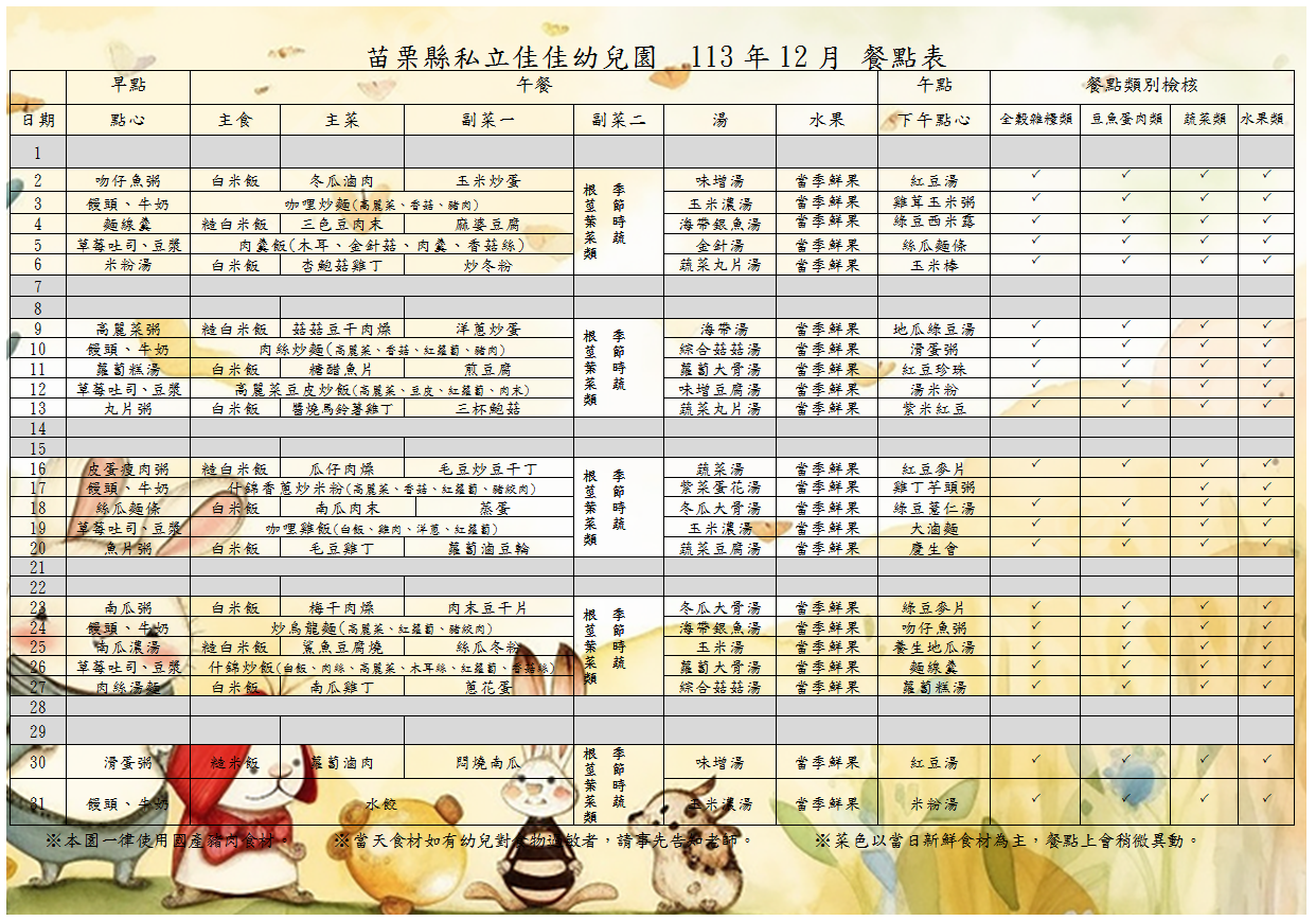 113年12月份餐點表