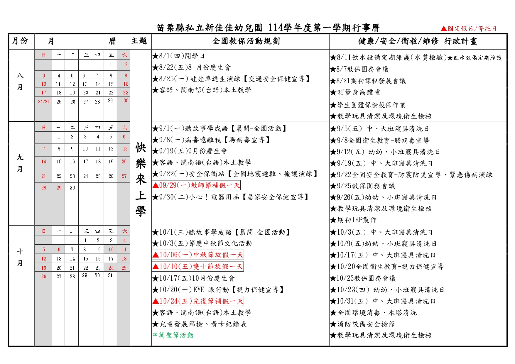 114學年度第一學期行事曆